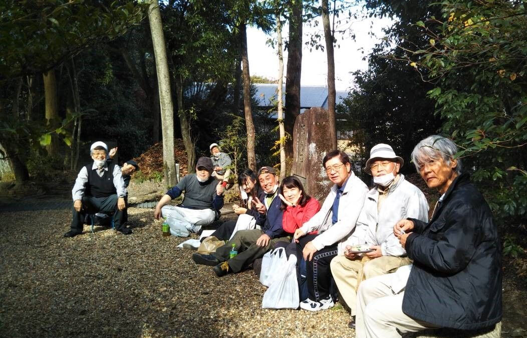境内で木漏れ日を浴びながら昼食と紅葉を楽しみました。