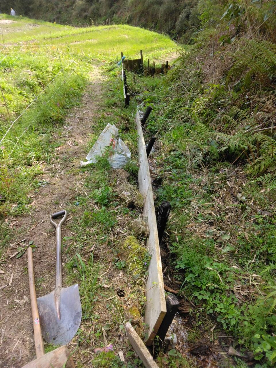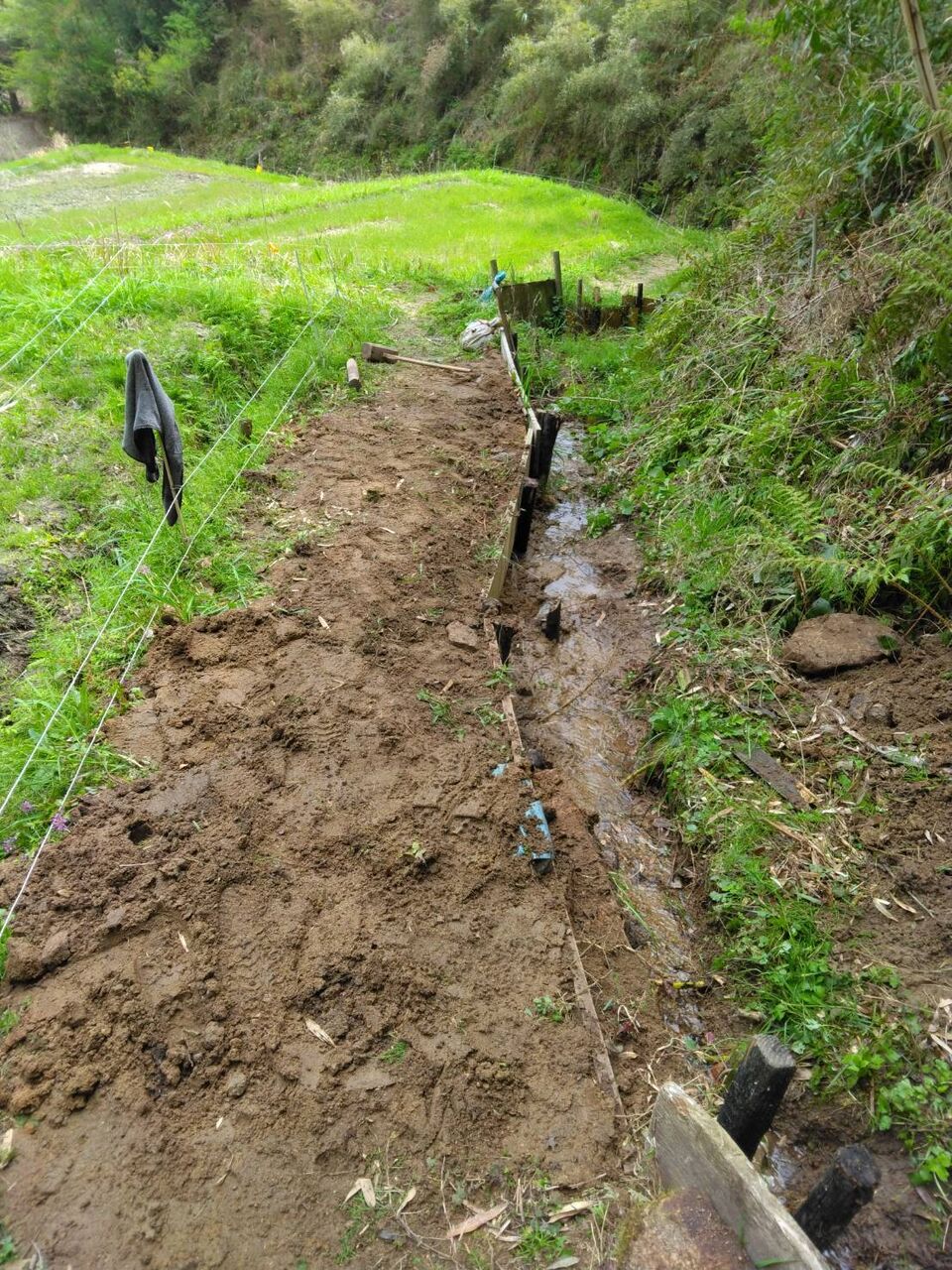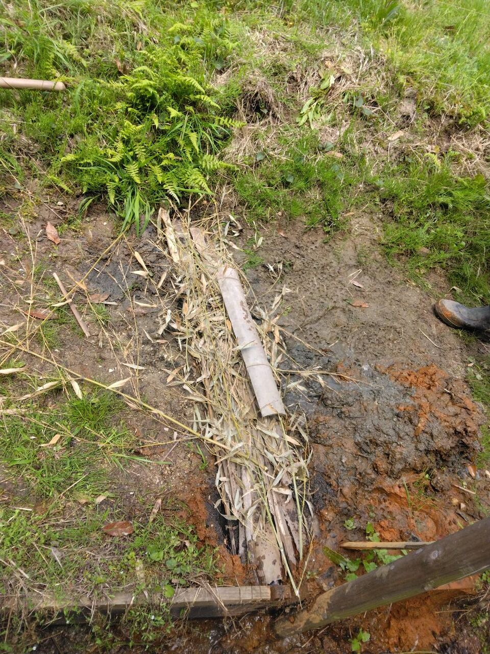 田んぼ側の土手から水が湧き出て、通路が水浸しになっていたため
