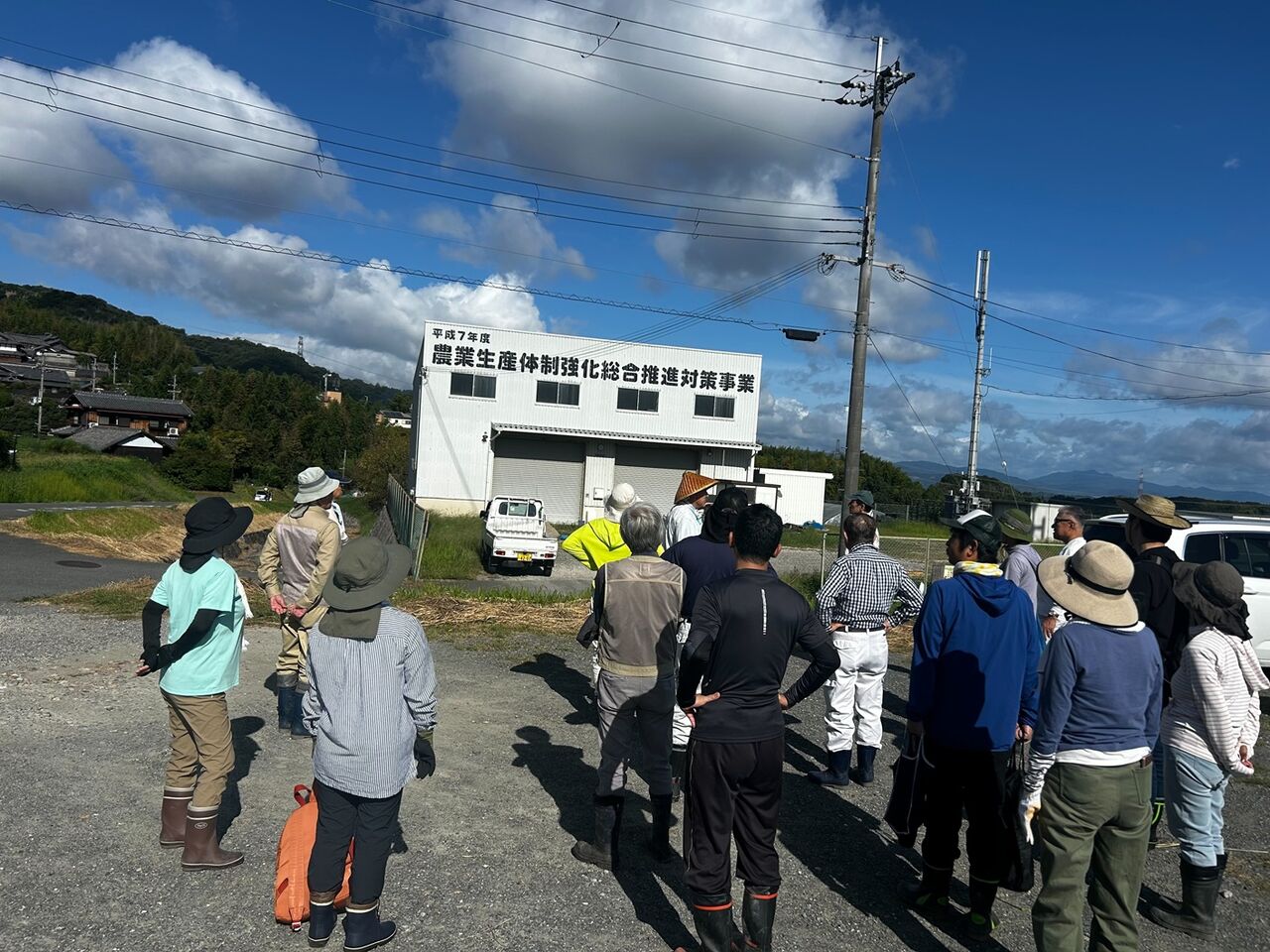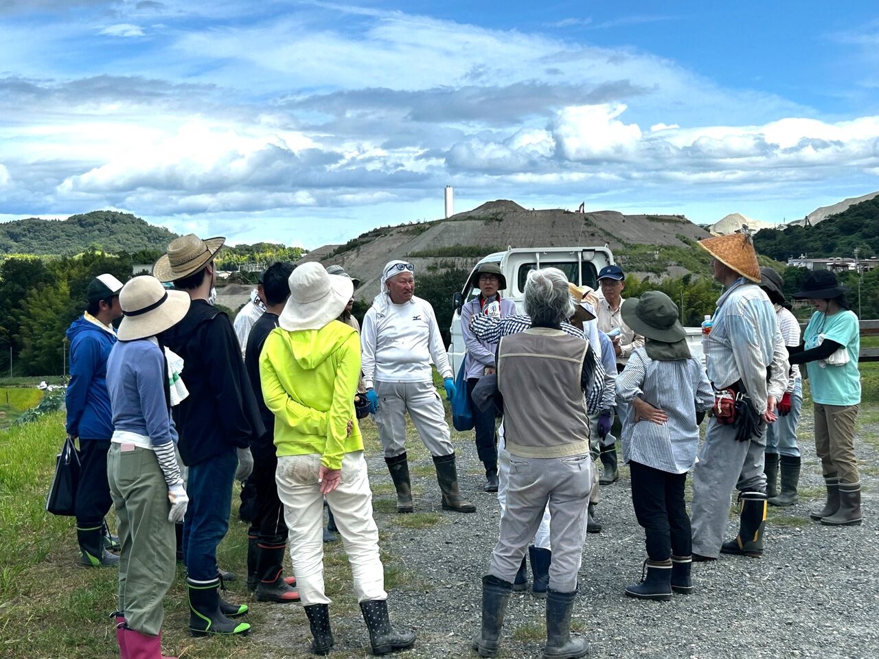 集合場所で準備体操とミーティング(作業説明)