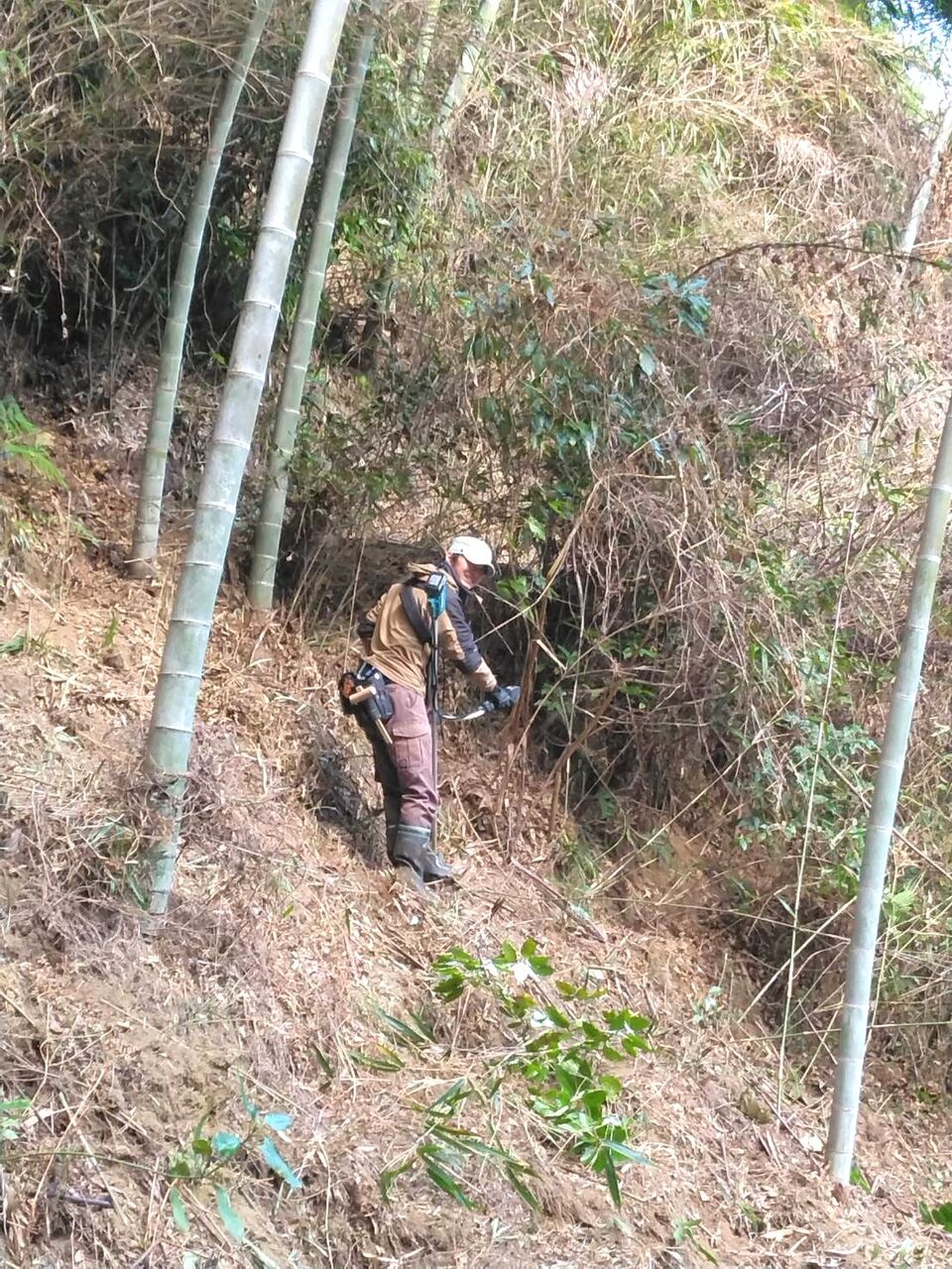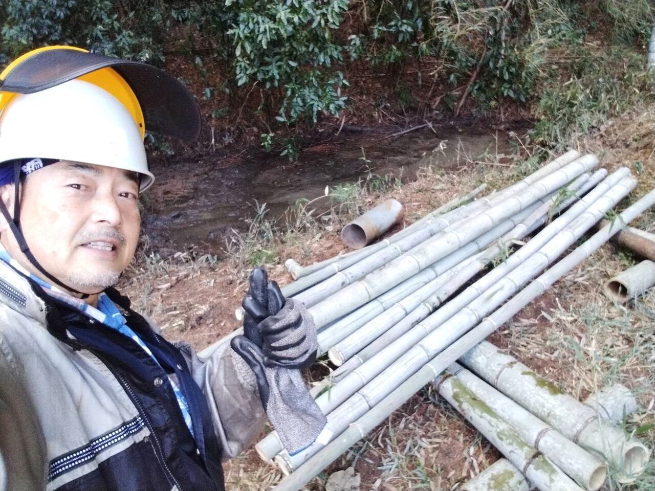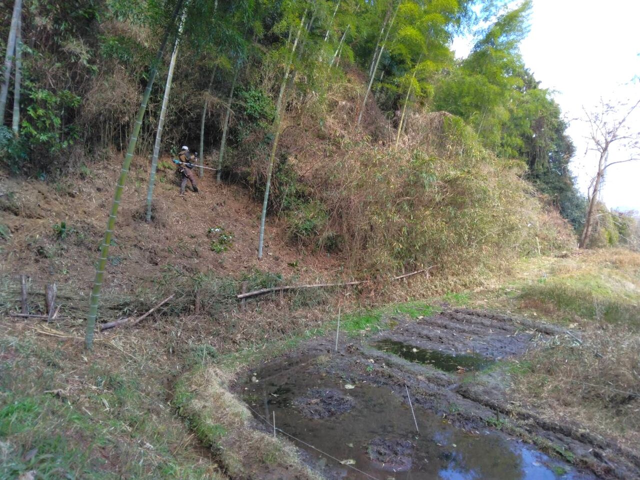 今回は先日伐採した竹の処理と土手の笹刈り、