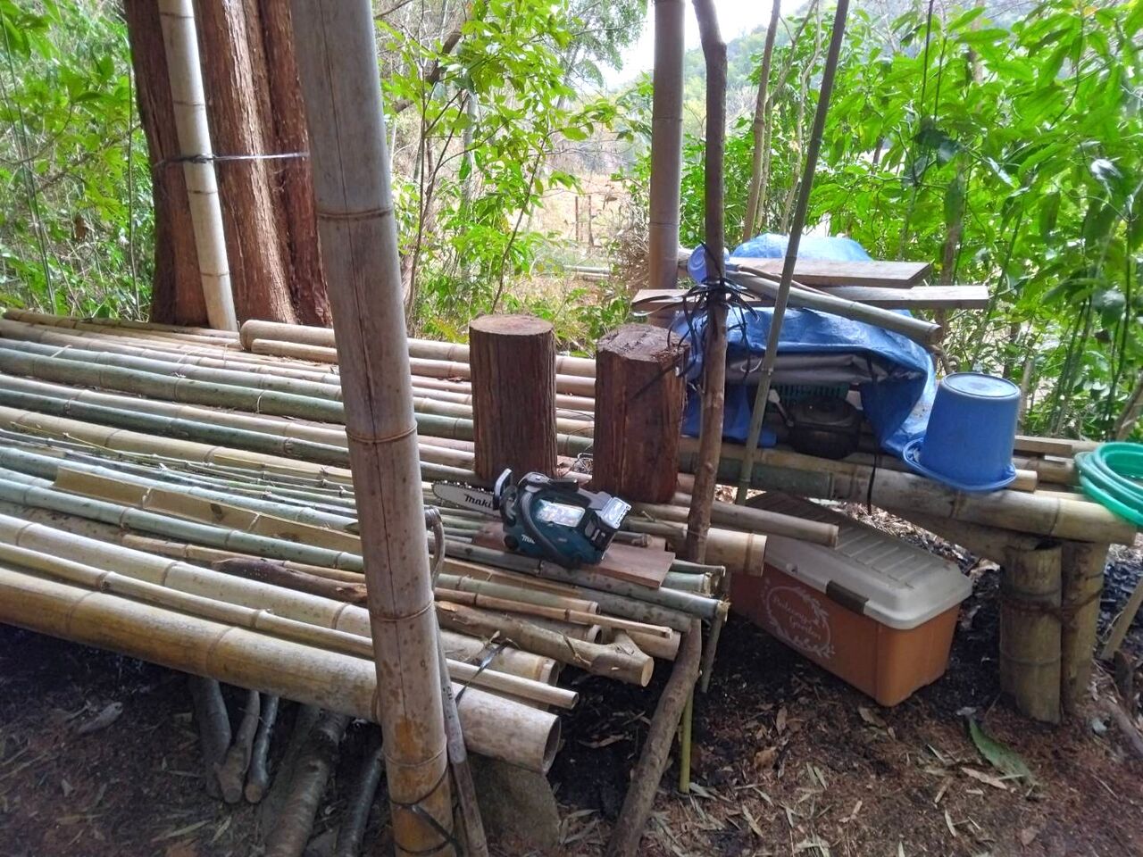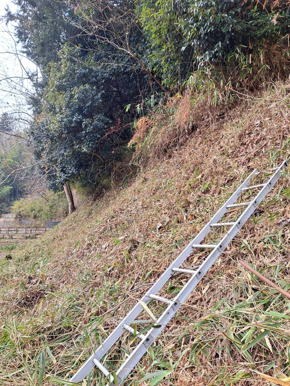 今回は、3名で、竹伐採、伐採竹の処理、土手の笹刈り作業を