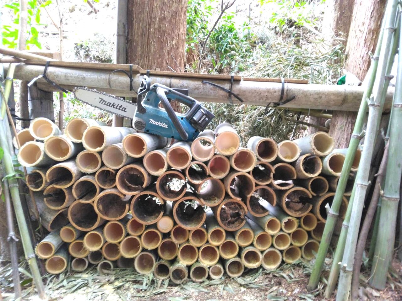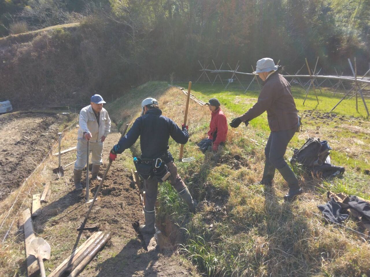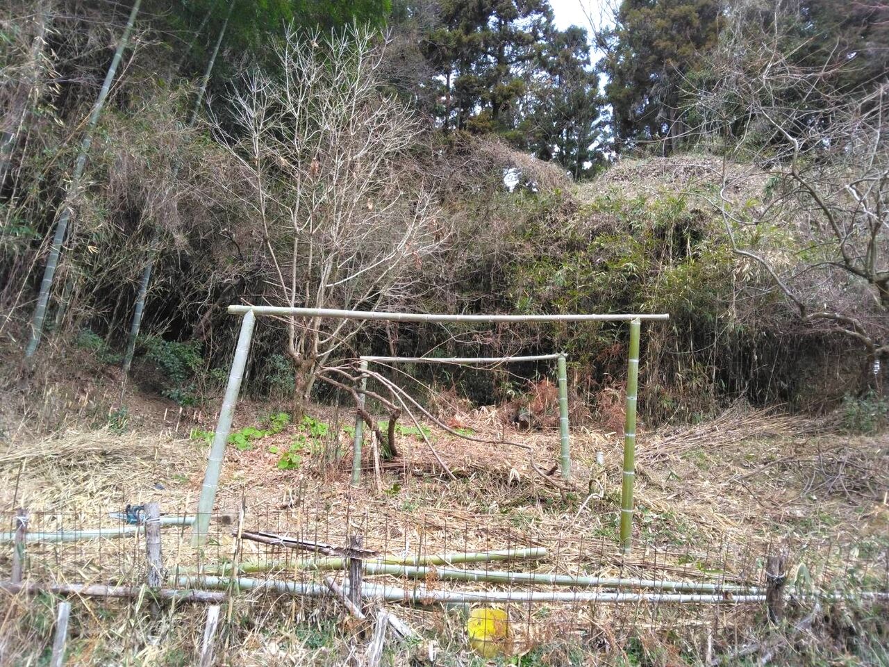 今日は、午前中、2時間程の作業でキウイの棚を作りました。