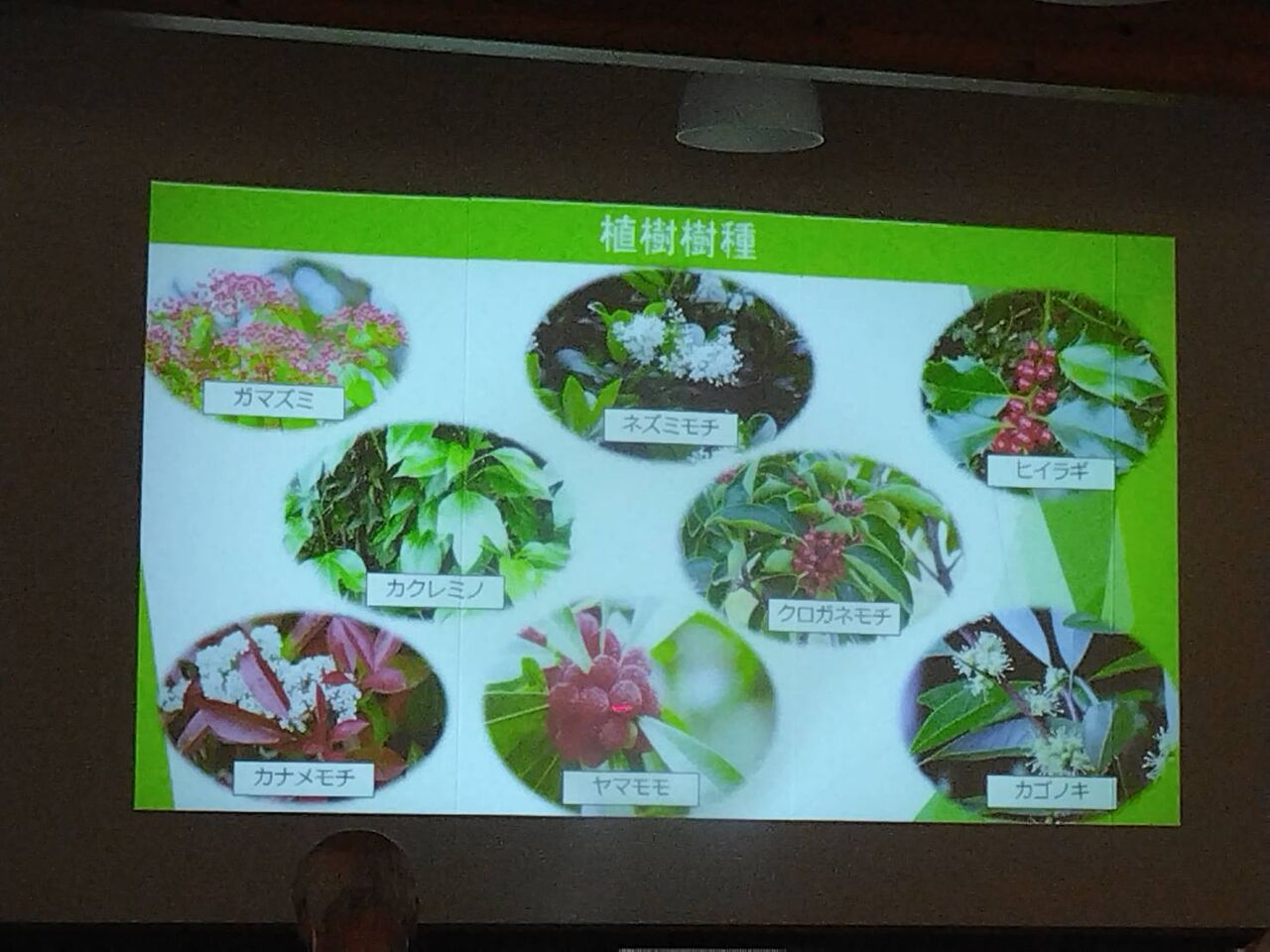 クロマツ、イヌザンショウ、ムラサキシキブ、マルバアオダモなど、
