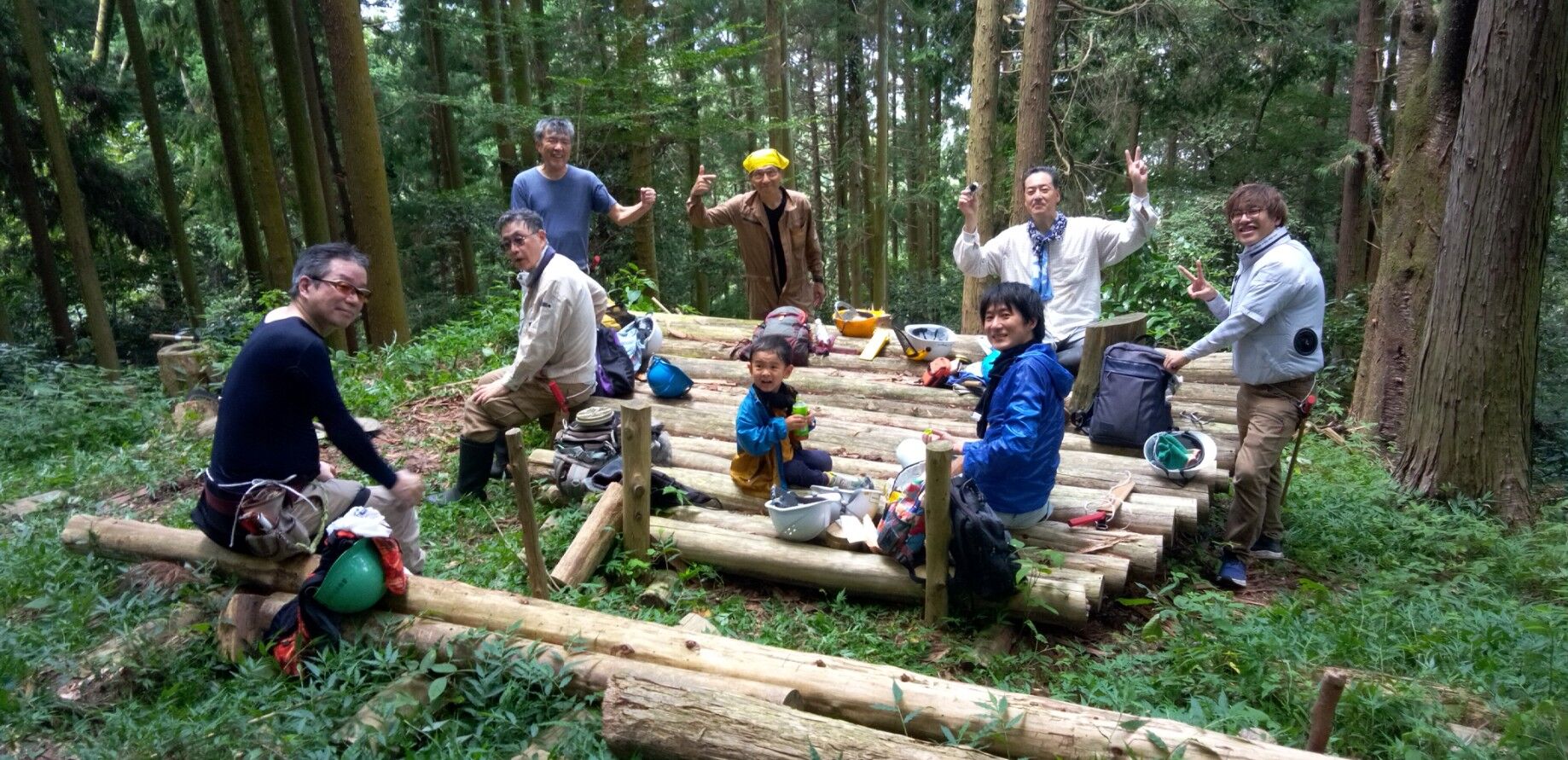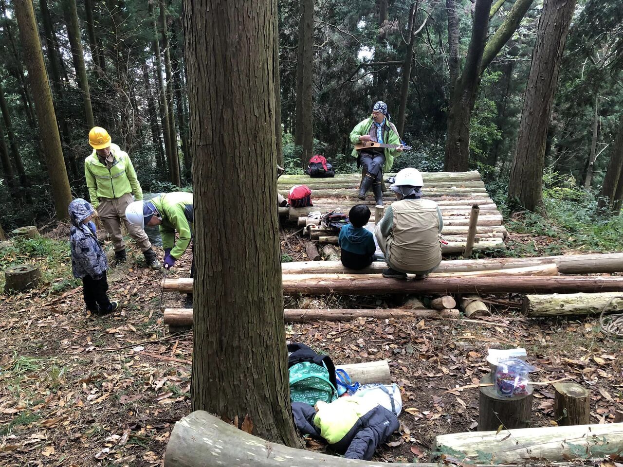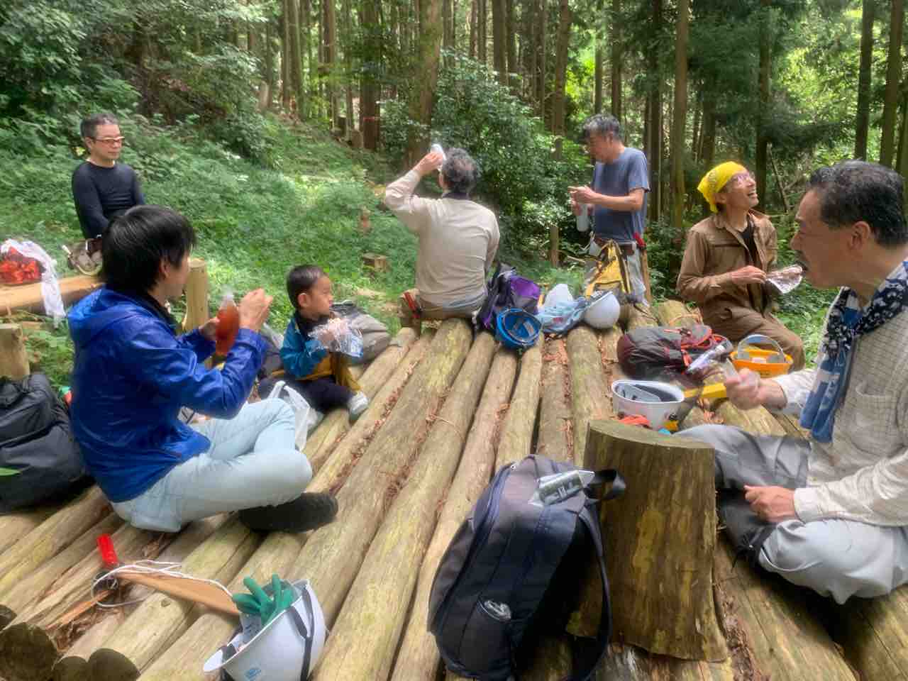丸太デッキで昼食