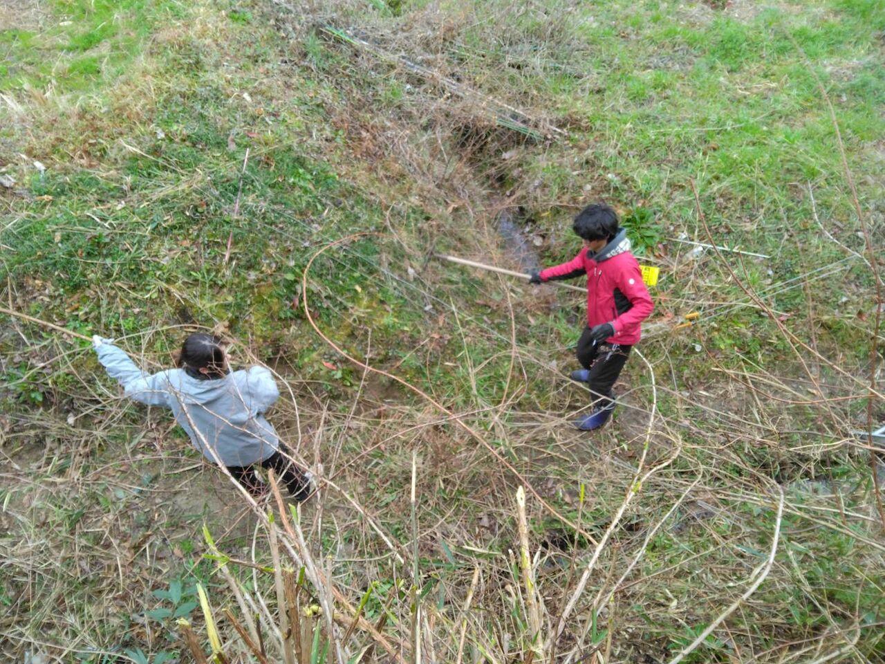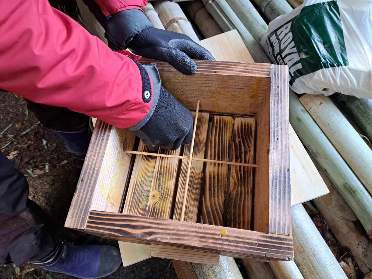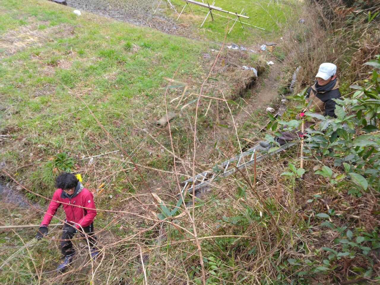 土手の草刈りと草集め、ハチの巣箱づくり等をおこないました。